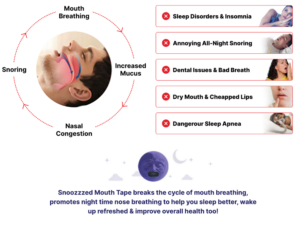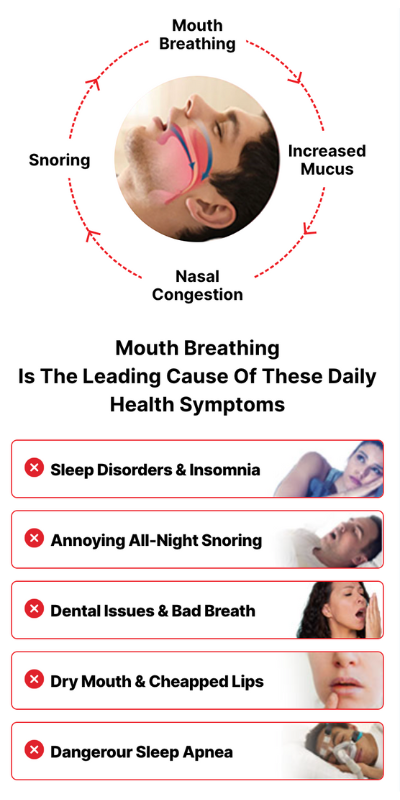 Mouth breathing bypasses the natural filtration system of your nose, allowing dust and microbes to enter your system and disrupt your sleep. It also creates a vicious cycle: poor sleep leads to more mouth breathing, worsening health and sleep quality.